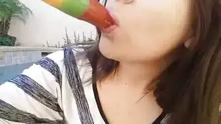 امرأة سمراء ساحرة تتعلم التعامل مع اثنين من قضبان الصخور الصلبة في نفس الوقت