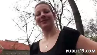 الركوع نحيف شقراء مع الثدي الصغيرة في مكان عام والحصول على مارس الجنس طوال اليوم.
