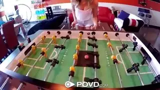 إنها مستلقية على المنضدة وهو يخترقها بشكل صحيح